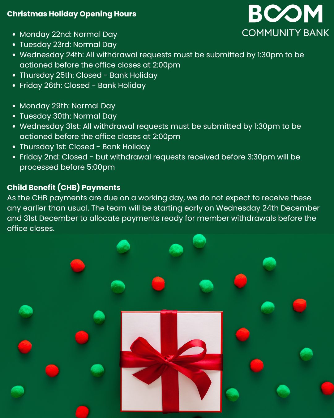 🎄 Christmas Opening Hours – BOOM Community Bank 🎄